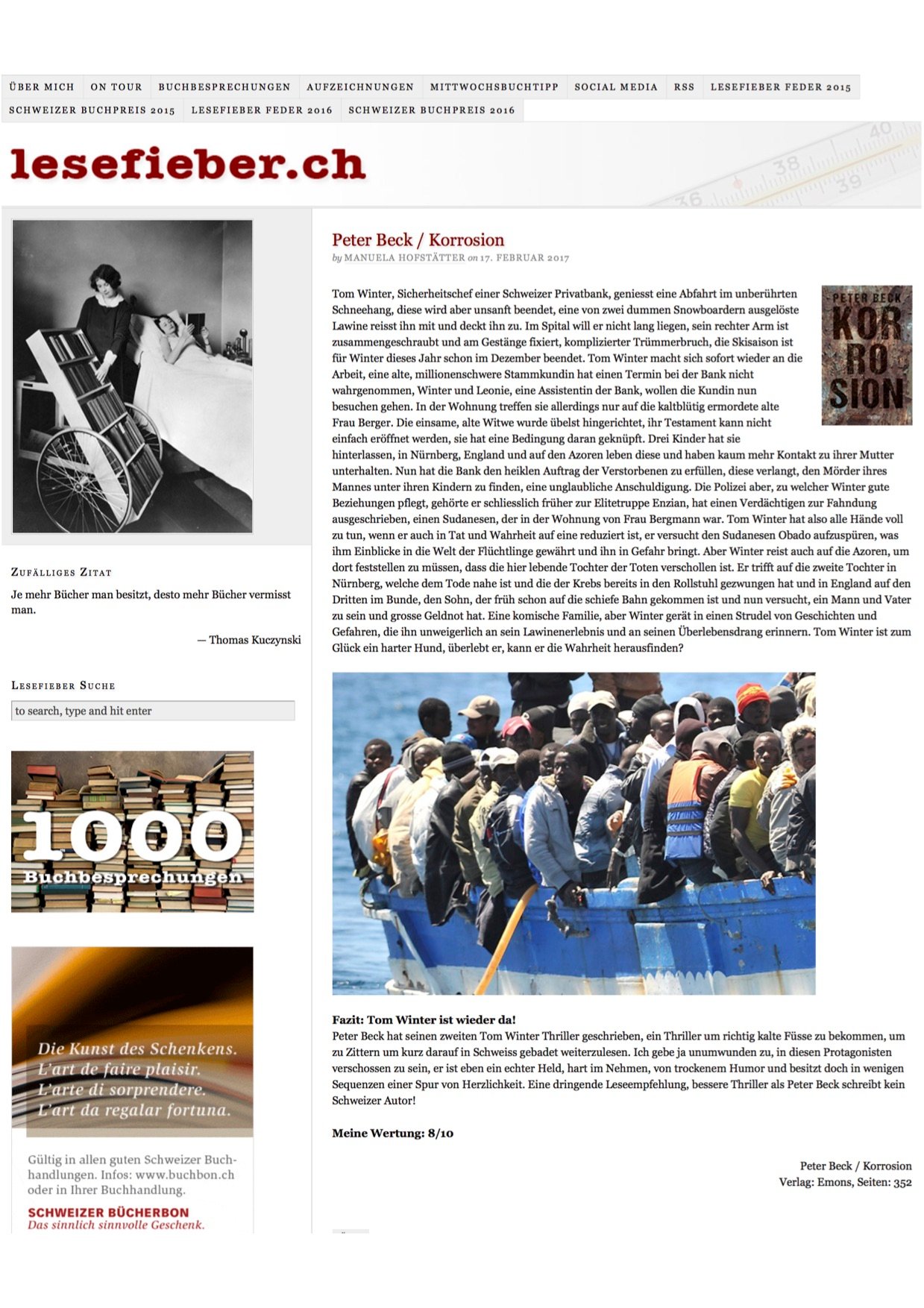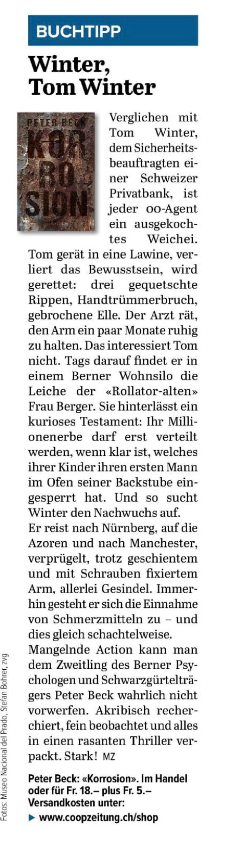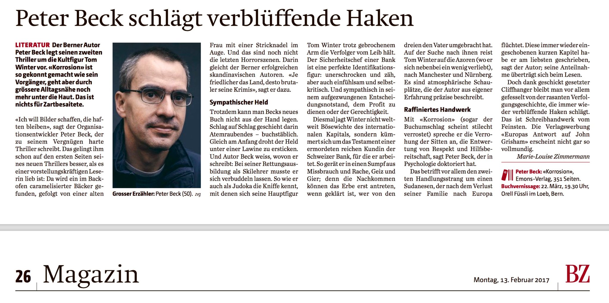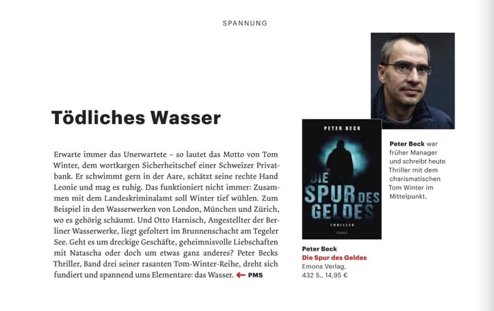 “Brilliant thriller.” TripFiction - “Enormous pace. A treat.” Mystery People - “Top-notch crime fiction!” Buchjournal - “Breath-taking action.” Buchmagazin - “Utterly convincing thriller” Neue Westfälische - “Brilliantly constructed thriller!” Deutsche Presse Agentur dpa - “Great storyteller, intelligent reading.” Berner Zeitung - “Awesome!” Coopzeitung - “A truly international thriller” Rhein-Main-Magazin - “Fast-paced international thriller” Tourbillon Magazin - “Ingenious, tough thriller” Lübeck Kultur-Magazin - “Fascinating hero.” Anzeiger von Saanen und Gstaad - “Fast, cool and laconic, with strong women.” Sakida Interviewmagazin, Hamburg - “His name is Winter, Tom Winter.” Der Bund - “Thriller à la James Bond.” Könizer Zeitung - “Captivates readers immediately. Swiss James Bond” (9 out of 10) Krimikiosk - “Great suspense guaranteed, dry humour.” Das Hauptstadt Magazin - “Convincing, gripping.” ekz Bibliotheksservice - “Laconic and dramatic.” Telepolis - “Strong characters.” Berner Oberländer - “Gripping holiday reading.” Seniorenweb - “Breath-taking story, great finale” Buch der Woche - “Wham, bam. Scenes of deadly danger.” Thuner Tagblatt - “Great arc of suspense. Gripping from the first page to the end.” Lebenszeit - “Specacular debut.” Österreichischer Kulturpass - “Cult figure Tom Winter” Thuner Tagblatt - “My favourite investigator!” Stephanus Buchhandlung - “Accomplished characterisation.” Der Bund - “Great storytelling” Leserkanone - “Beck delivers!” Berliner Bande - “Outstanding thriller. Fascinating investigator” Tatort - “Cool, matter-of-fact, fast.” Meine-Kommissare(dot)de - “Perfect action cinema!” Laberladen - “Fast-paced” 20Minuten - “A page-turner” 100 Geschichten - “Sophisticated suspense” Dorfzeitung(dot)com - “Action-packed” Luzerner Zeitung - “The reader gets sucked in” Lesart - “From page-turner to chamber drama” Thriller&Krimiclub - “Definitely recommended reading!” Kriminetz - “Brilliant characters.” Finanz&Wirtschaft - “No Swiss author writes better thrillers” Lesefieber